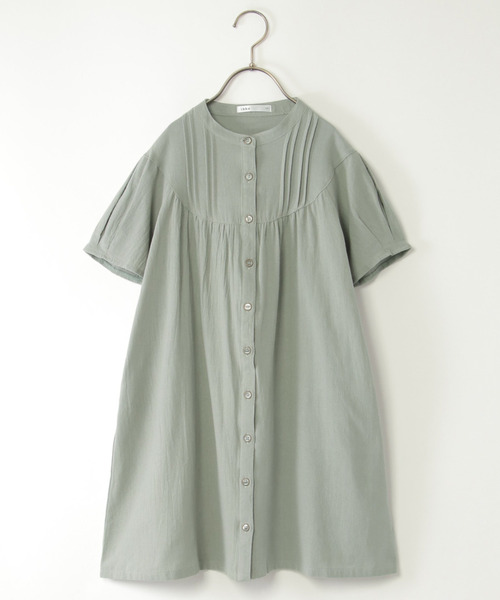 ””シンプルなノーカラーシャツワンピース。