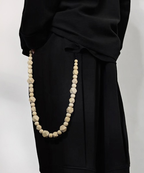 極太のウッドビーズが存在感を放つウォレットチェーン。デザイン性と豪華さを兼ね備えたテザイン。普段のスタイリングにプラスするだけで、着こなしのアクセントに。トレンドのタックインスタイルの腰回りにも相性抜群の、今シーズンおススメのアイテムです。