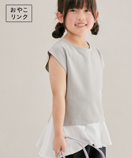 ・裾から布帛のフリルが覗く、レイヤード風のジャージートップス。