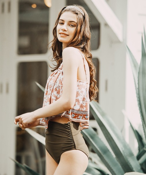 エスニック調のパネルプリントがポイントのワンピース風のセパレート水着です。