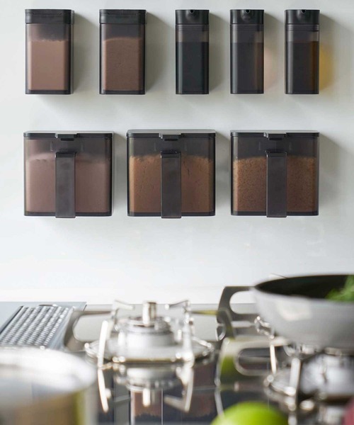 マグネットが付く冷蔵庫やパネルに簡単取り付けの調味料容器シリーズ。