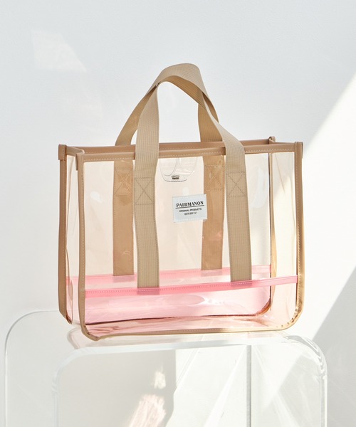 シンプルな形のトートバッグですが、レザー調のパイピングとペアマノンのネームタグがデザインのアクセントに。