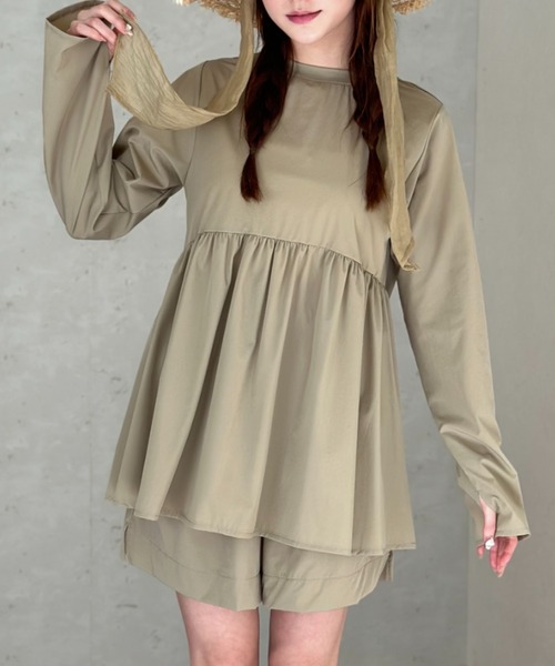 フレンチスリーブ×ぺプラムシルエットでカジュアルに着回せるラッシュガードプルオーバー。
