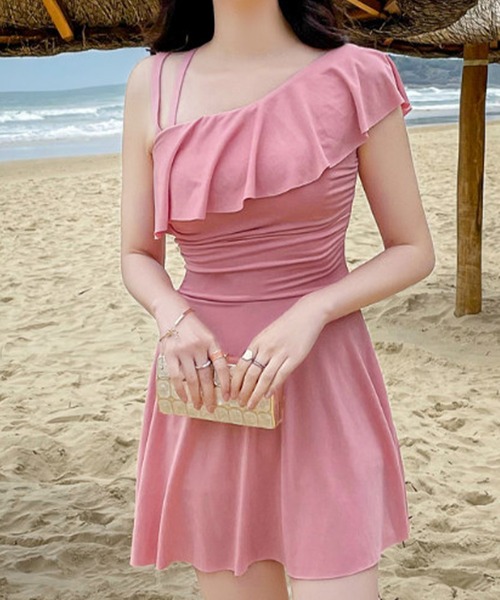 アシンメトリーデザインで洒落感たっぷりにおつくりした、ワンピースタイプのスイムウエア。