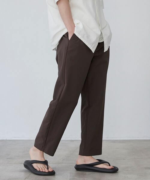 程良くスリムなシルエットで裾にかけてテーパードし、ウエストはゴム仕様で穿き心地抜群でありつつも裏側に収納可能なドローコード付きでカジュアルすぎない印象に。