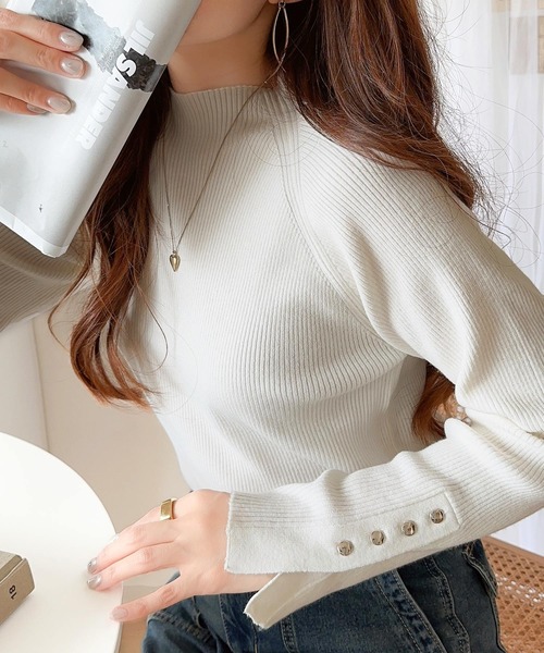 シンプルながら袖口のボタンディティールがさりげないアクセントになっているリブニット。