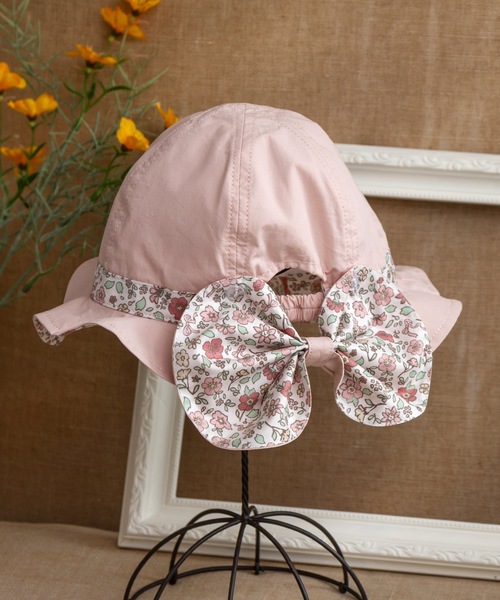 お花のようなひらひらブリムに、大きなフラワーリボンのバックスタイルがキュートなハット。