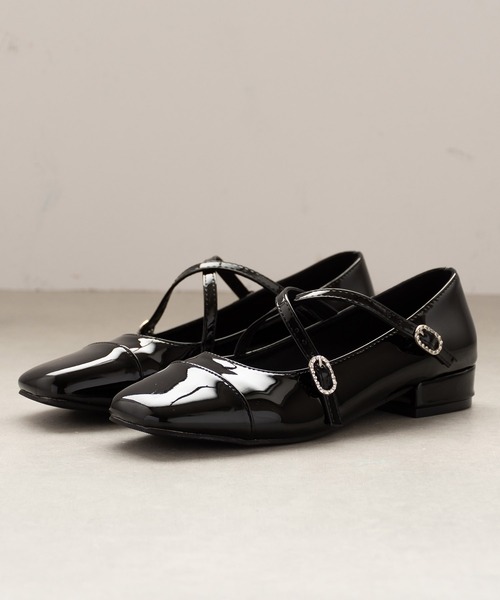 スクエアトゥのつま先とクロスストラップが可愛いパンプス。