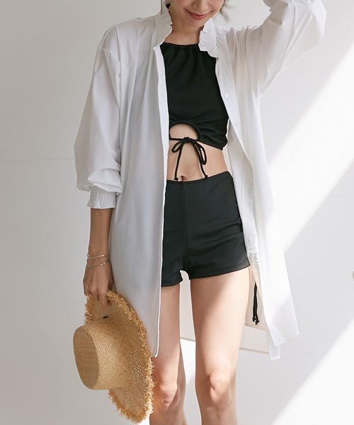 シャツタイプなので隠したい所だけボタンを閉めて水着チラ見せもカワイイ。