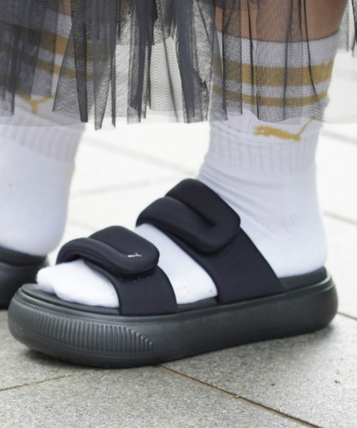 厚底のシルエットがフェミニンでかわいらしい雰囲気を演出します。足入れしやすいスライドタイプのアイテムながら、柔らかい素材を使用したベルト部分が優しく足を固定。快適な履き心地を提供する一足です。夏のレジャーやお出かけにぴったりです。