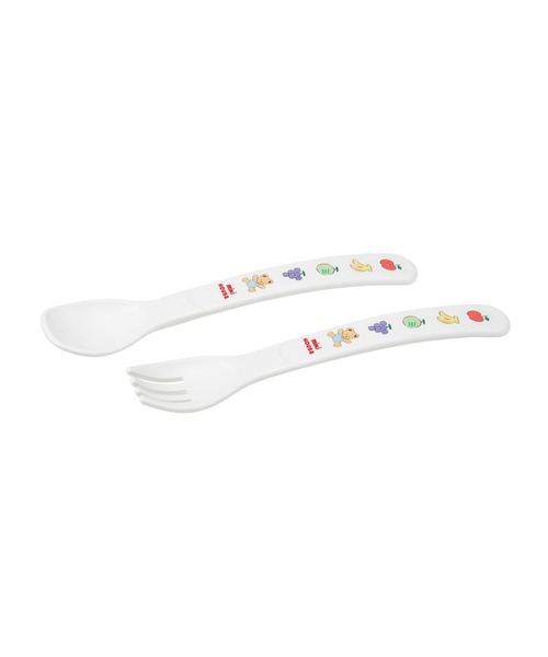 ベアとフルーツ柄がかわいいスプーンとフォークのセット。