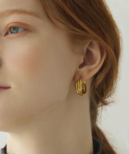三本のラインがクロスしたようなデザインのピアス。カジュアルからフォーマルまでどんな服装にもマッチする華やかな印象です。互いにねじり合う三本のフープがシンプルながら、存在感があります。