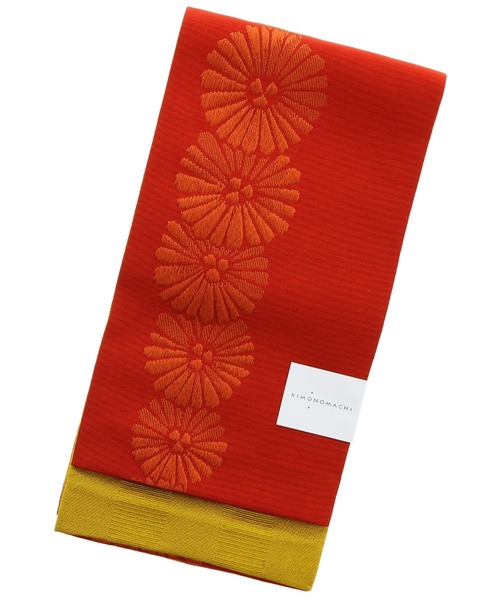 レッド系:明るい黄系の赤に、深いオレンジ色の花模様が並んだ帯。菊花のような唐松文様のような、シンプルながらどこか古典的な雰囲気のあるデザイン。裏は金茶色の地に織の二筋の縞。