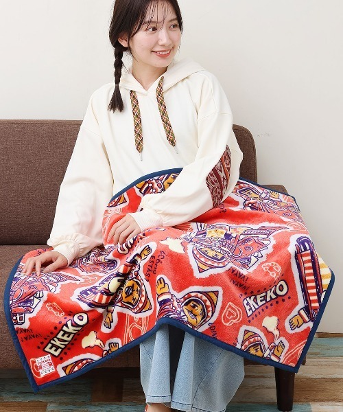 通常のブランケットとしての使用はもちろん、ループが2ヵ所付いているので、腰に巻いたりポンチョとしてもお使いいただけます。