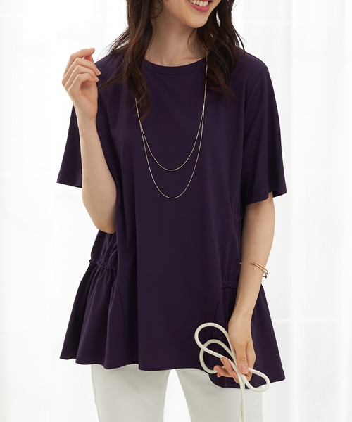 キレイ見えする冷感素材。両サイドのギャザー切替がウエストを、長めの丈が腰まわりをすっきり見せます。
