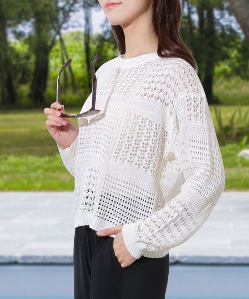 トップスは、涼しげな透かし編みニットで、お手持ちのハーフトップやキャミソールと重ねても◎