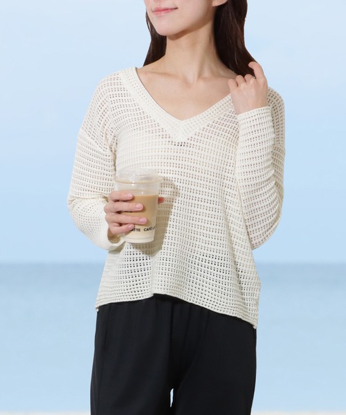トップスは、涼しげな透かし編みニットで、お手持ちのハーフトップやキャミソールと重ねてコーディネートをお楽しみいただけます。
