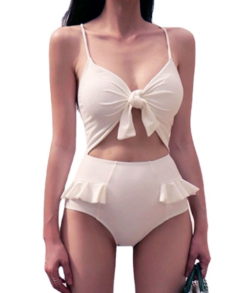 水着 フロントリボン カットアウト フリル ワンピース 水着 レディース
