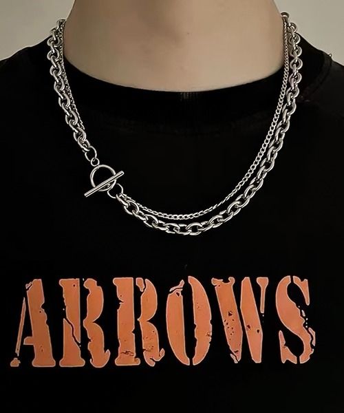 2連のチェーンが、シンプルでありながらも視覚的にインパクトを与えるデザインです。異なる質感と太さのチェーンが重なり合い、ユニークなレイヤードスタイルを実現。
