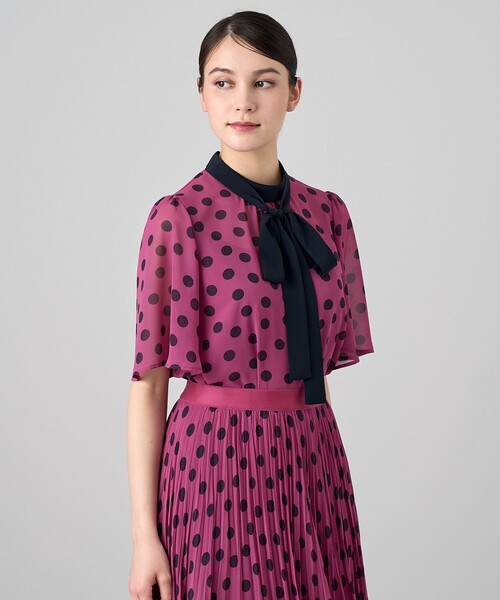 無地のボウタイリボンをポイントにしたドットブラウス。