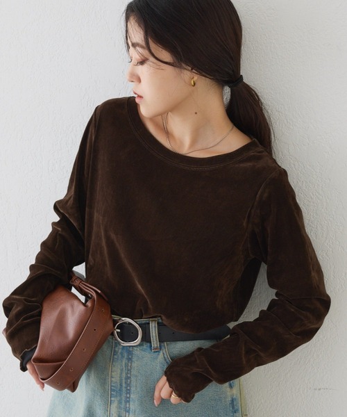 品のある光沢感が魅力のベロアのような触り心地のトップス。