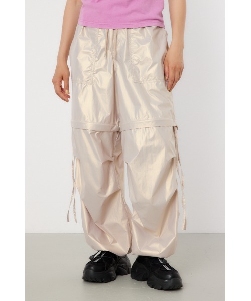 トレンドのメタリックコーティングのナイロン素材を使用。ウエストはゴム仕様でドロストを施し、脇に垂らした共地テープがアクセントに。裾口にはエラスティックコードのドロストがついているので、シルエットの変化も楽しめるアイテムです。