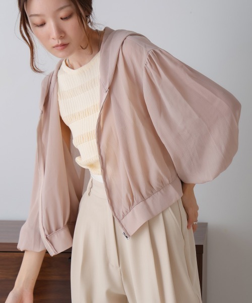 楊柳のさらっと生地が心地よい夏のライトブルゾン。フード付きで日除けやクーラー対策にもにぴったりの1枚です。袖口のシャーリングと背中の切替ギャザーで可愛いらしさがUP!袖を捲ってお召し頂くと 手首の華奢見えも期待できます。優しいシアー加減とオシャレなくすみカラーも魅力的です。ゆるっとしたイージーな着心地で夏のリラックスコーデをアップデートしてくれます。