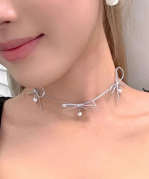 繊細なリボンモチーフとパールが華やかさとかわいらしさが魅力のチョーカーです。デコルテラインに沿うように長さを調整すると首元をすっきり見せてくれます。カジュアルな日常から、フォーマルなシーンまで幅広く活躍し首元に華やかな印象を与えてくれます。