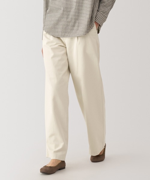 フロントのタックに立体感があり、腰回りはゆったりとしたシルエット。後ベルト部分には窮屈感がなく、ウエストに馴染む平ゴム入りで、もたつきもなく快適な履き心地です。オーセンティックなデザインと、女性らしく美しいシルエットを兼ね備えたパンツです。