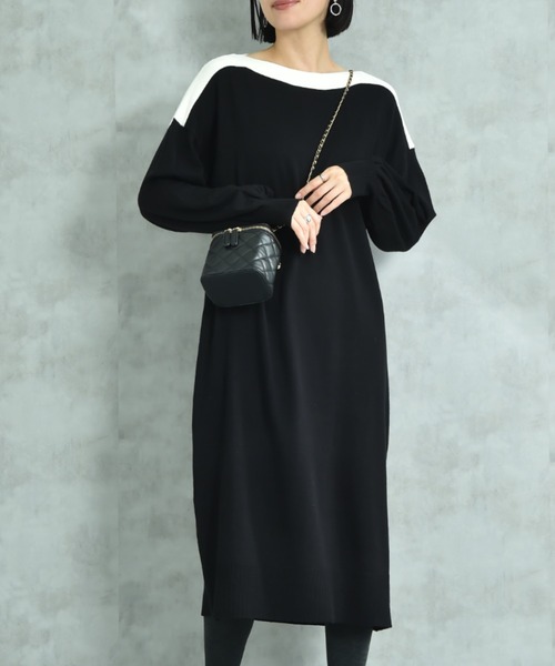 毎シーズン人気のボートネック配色!今季はワンピースも仲間に入り!ネック配色が目を惹き、シンプルになりがちないつものスタイリングに映える主役級のニットワンピースです。控えめなボートネックとドロップショルダーのバランスが絶妙◎さらりと合わせるだけでこなれた印象に決まり、さりげないボリューム袖はニュアンスが出て女性らしさを演出してくれます。また体のラインを拾いにくく、着心地も抜群の1枚です。