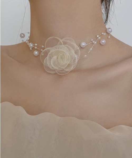 シアー素材の花と大小粒の違うパールが
