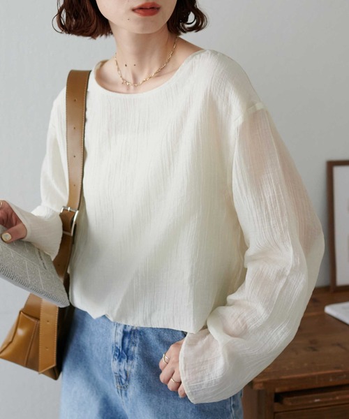 ・しっとり落ち感のあるレーヨン素材に、ナイロンの軽やかさをプラスした、さらっと心地よい肌ざわり●スタイリング・トレンド感のある表面感で、シンプルなボトムと合わせるだけで華やかな印象に