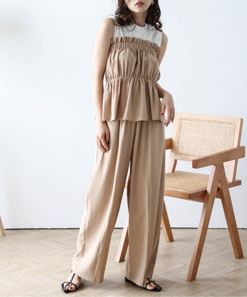 ギャザーベアトップセットアップタンクトップとベアトップのフェイクレイヤードのトップスと、