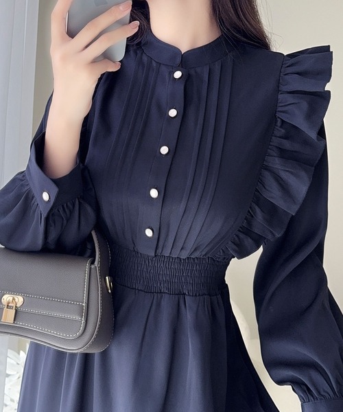スタンドカラーでフロントピンタックデザインのワンピース。