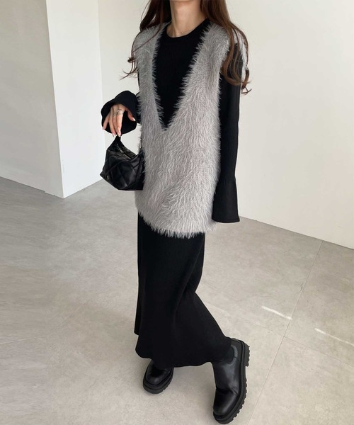 トレンドのシャギー素材のベストとリブワンピースのセットアイテム。