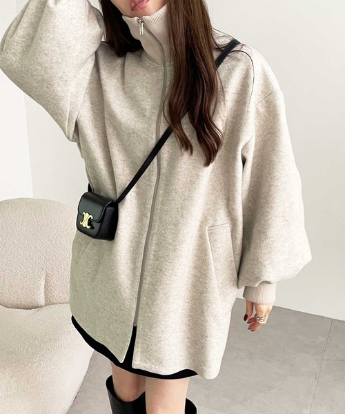 微配色のリブ衿が目を惹くフェイクウールアウター。