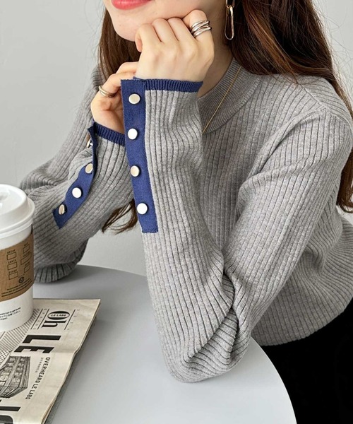 袖口のゴールドボタンがポイントのリブニット。