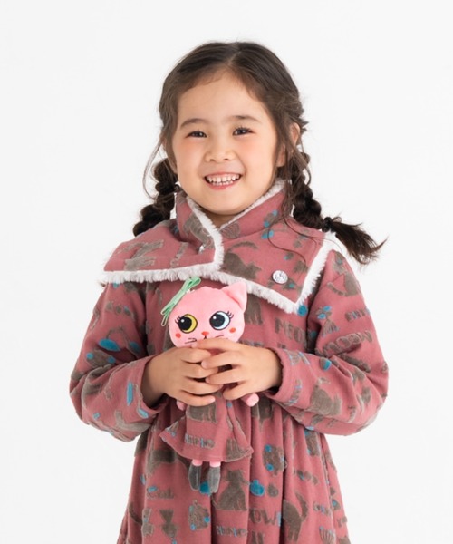 ねこにロゴや花、フルーツをモチーフにしたninoオリジナル生地を作り、ネックウォーマーにしています。