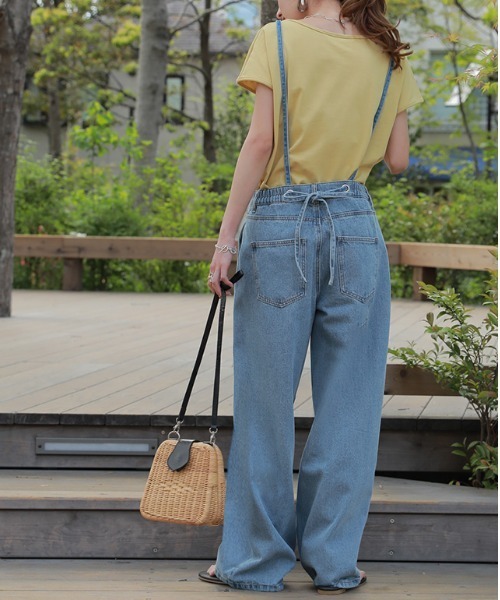 取り外し可能な結びのサスペンダー紐がつき2WAYで楽しめるデニムワイドパンツ。