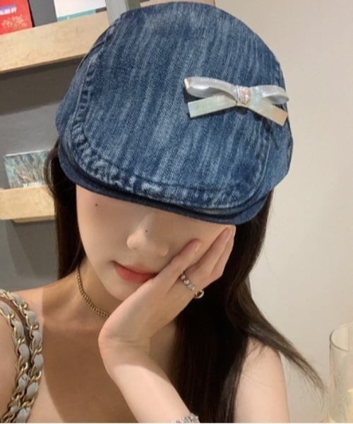 デニム生地にシルバーのリボンが付いてるハンチング帽。