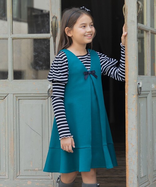 合わせるインナーで前後を変えて着用できるジャンパースカートです。