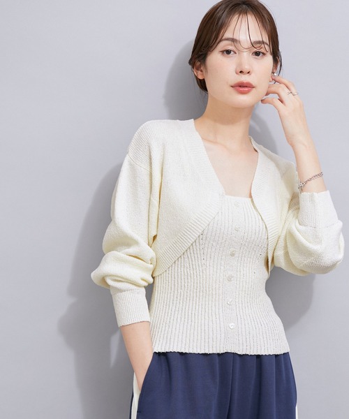 タイト目なニットキャミソールとたっぷりしたお袖のボレロがセットになったアイテム。