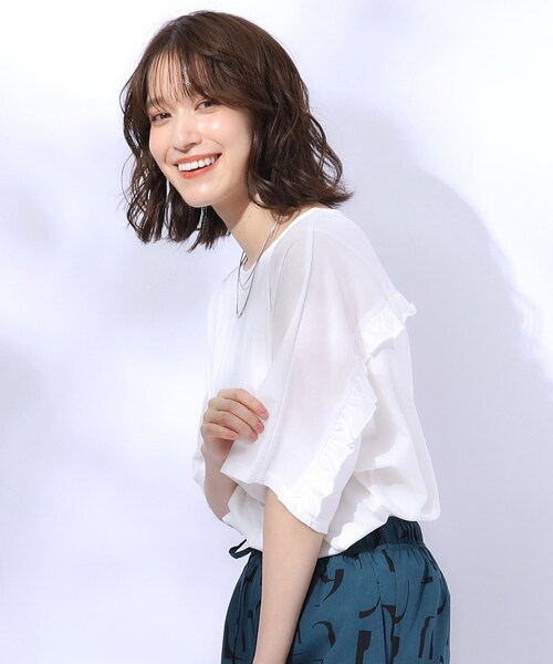 さらりとした柔らかいコットン素材で、後ろ身頃にフリルディティールを入れたドルマンスリーブのトップスです。