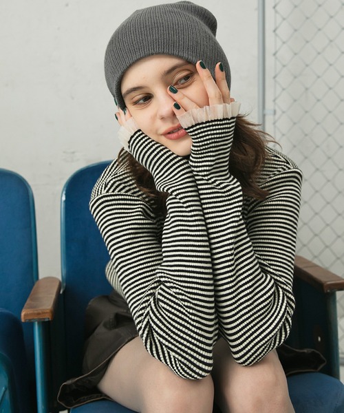 袖のシアーフリルデザインが他と差がつく着回し力抜群の大人レディな万能リブニットプルオーバー