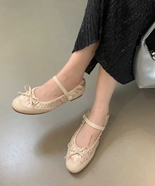 丸みのあるつま先と華奢なリボンがフェミニンな足元を演出。
