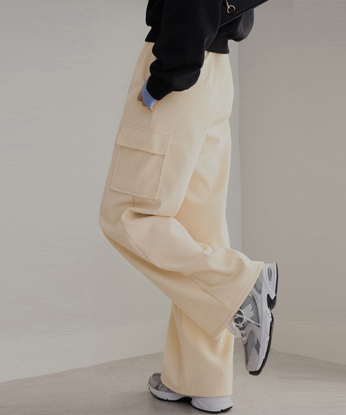 季節感たっぷりコーデュロイ風リブ素材カーゴワイドパンツ