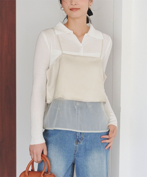 ・やや透け感のあるリブニット素材の襟付きカーディガン