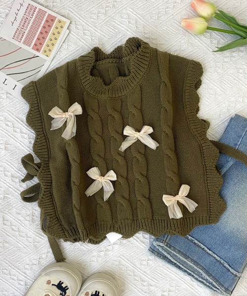 すっぽりと頭からかぶせるだけで着せられるサイドに結びひも付きのニットベスト。