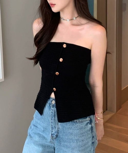 シンプルで、オシャレ度高めな着回しやすいベアトップ。