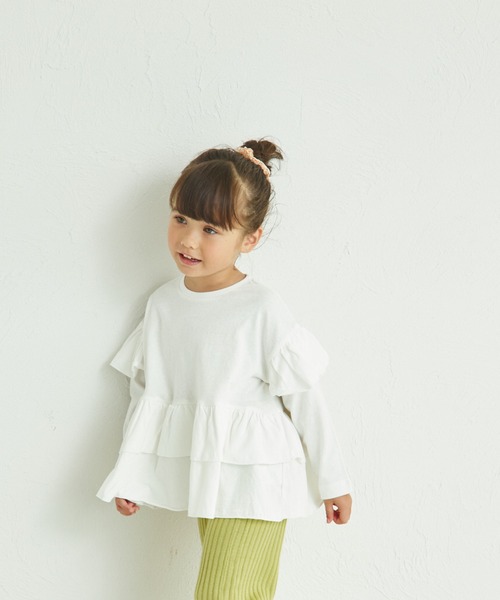 シンプルな無地の素材ながらも肩と裾のフリルが華やかな長袖Tシャツです。